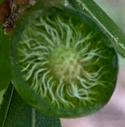 Galls.--Greenish brown and yellowish green round, globular galls, issuing from bud axils of Quercus aquatica [nigra]; they vary greatly in size from one-quarter to half an inch in diameter. The outer shell is very thin, and interiorly there is a central kernel held in place by some very thin hair-like filaments.