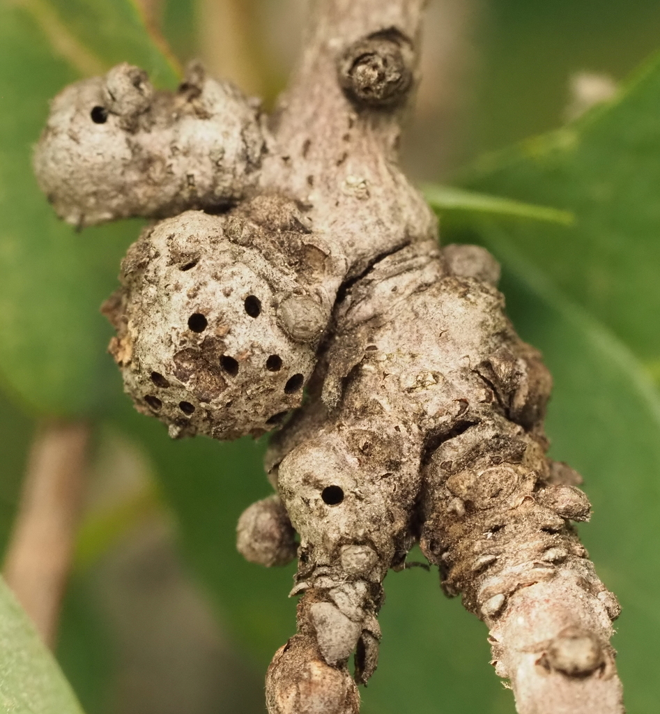 A small, irregular, apparently polythalamous stem swelling on Quercus laceyi. This gall is likely the agamic generation of the wasp that induces a midrib swelling in the spring, given that it is abundant on the same host tree on which that gall was abundant, and because it matches other agamic galls known from Kinsey's Neuroterus quercicola complex, like Neuroterus washingtonensis.