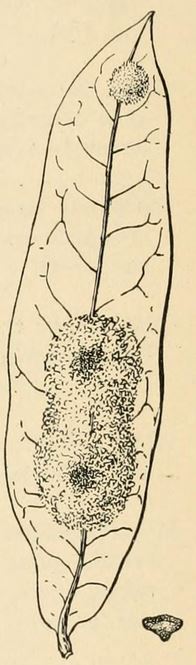 Gall. An oblong, wooly gall on the upper or lower surface of the leaves; the wool is fawn colored, long and fine, covering three or four, sometimes more irregularly rounded, flattened disks, in the centre of which live the flies; they are attached to the midrib by a nipple-like point; the disk or cell is concave above and measures .08 to .10 inch in diameter.