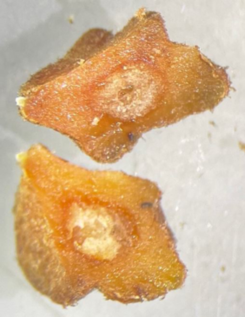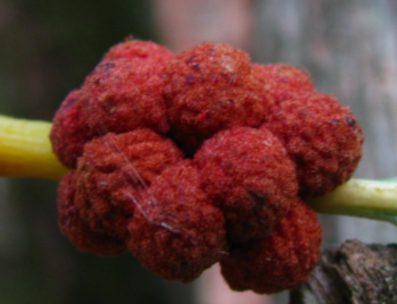 Gall: On the underside of the petiole of the leaf of white oak (Quercus alba) at the junction of the leaf blade, July to October. A rounded ball-like cluster of bright red or brownish galls closely pressed together and out of shape. The individual gall is rounded or tuberculated on the summit, flattened at the sides and pointed at the place of attachment. It is solid when fresh with a single barely visible larval chamber in the center. Late in September and in October the galls become detached, drop to the ground and the larvae continue to feed therein. The gall gradually changes its shape and becomes subtriangular or polyhedral and may be taken for that of another species. The outer shell becomes thin, soft, darker in color, and the inner part is eaten away until only a hard and woody shell remains. Diameter of clusters 8-20 mm. Individual galls 5-10 mm.
