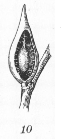 Quercus rubra. Red Oak. Elongated, fusiform, pale green gall, with a pedicel, inserted on the edge of the leaf and being the prolongation of a leaf-vein. Length about an inch.