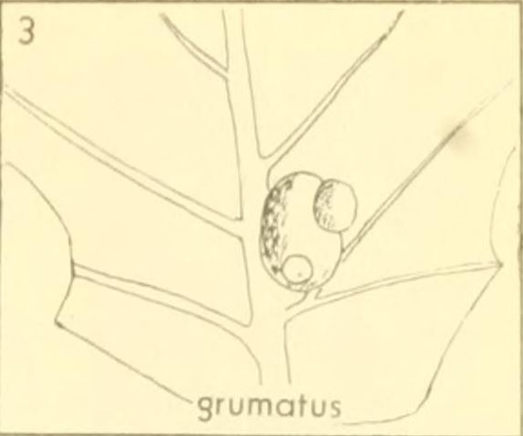 Gall.-- A smooth, bare, ellipsoidal gall about 3 mm in diameter attached to midrib on under side of the leaf in the fall and bearing a little fleshy knob on its summit exactly like the gall of rileyi (Ashmead) in the eastern United States.