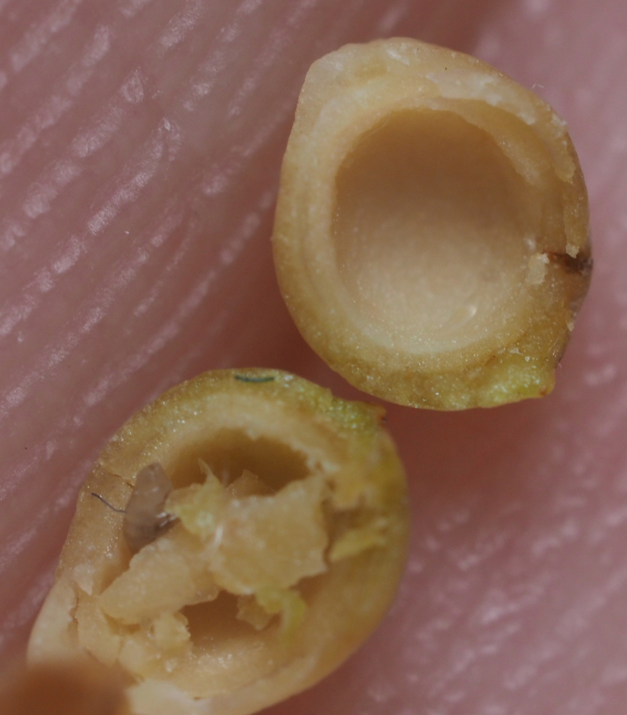 Gall.--A bud gall half protruding beyond the bud scales, produced in the fall and probably dropping to the ground when mature. Somewhat globular with a nipple at apex, green or brownish, smooth, truncate at base when detached without circlet of white hairs.