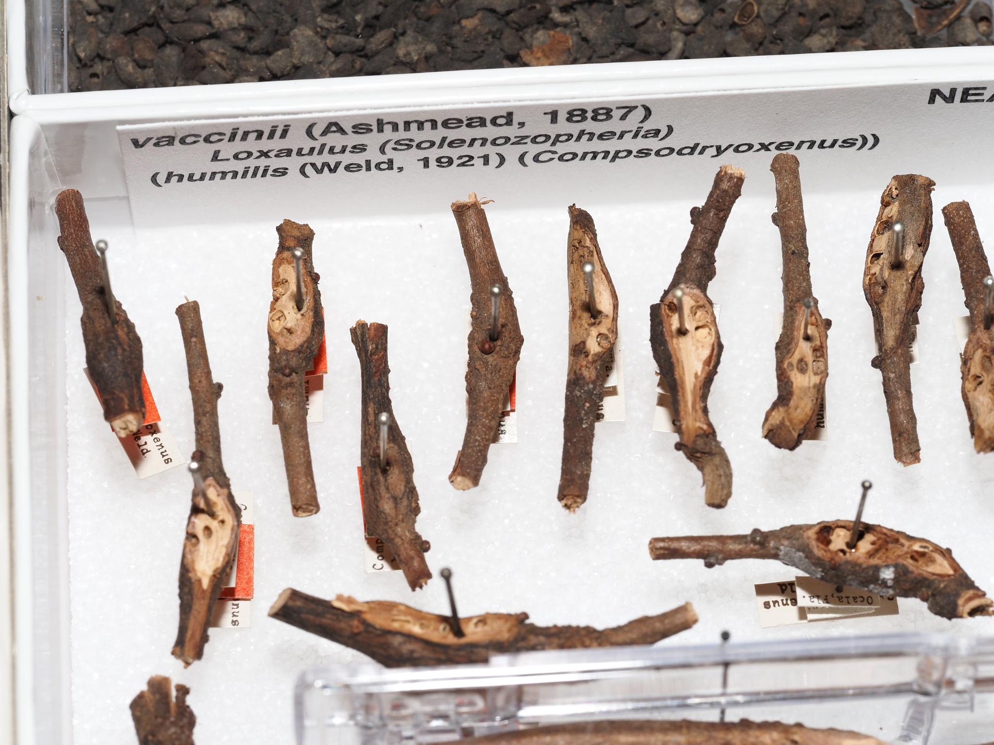 Solenozopheria Ashmead, 1887 was synonymized with Loxaulus Mayr, 1881 by Weld (1951: 643); hence Solenozopheria vaccinii was then recognized as Loxaulus vaccinii (Ashmead). This species had been described based on adult wasps reared from the wild low-bush blueberry Vaccinium angustifolium Ait. (as V. pensylvanicum Lam.) and the northern highbush blueberry V. corymbosum L. Melika and Abrahamson (2000) determined that Ashmead (1887) had incorrectly associated the galls with the adult gall wasps, and that the real gall inducer on blueberries was Hemadas nubilipennis (Ashmead, 1887) [Chalcidoidea, Ormyridae (after Burks et al. 2022)]. The actual hosts of L. vaccinii are oaks, Quercus chapmanii Sarg. and Q. stellata Wangenh. (Weld 1921). Also, Melika and Abrahamson (2000: 209) synonymized Loxaulus humilis (Weld, 1921) with L. vaccinii. For future reference in the text, L. vaccinii, an oak galler that does not gall blueberry, has not undergone any other taxonomic change and has never been included in Callirhytis Foerster, 1869. This information is critical for assigning hosts for parasitoid species (see below).