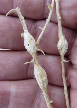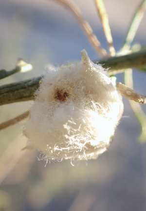 A tuft, white, woolly/hairy gall found on the bud/stem. Detachable.